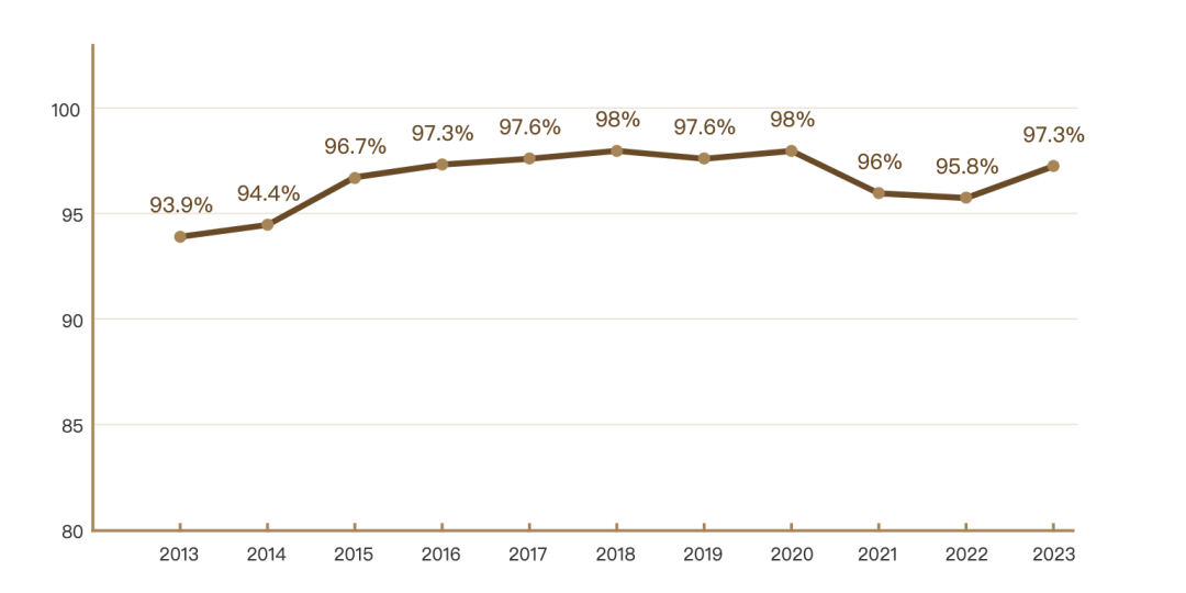 (2013-2023年日本应届毕业生就业率)